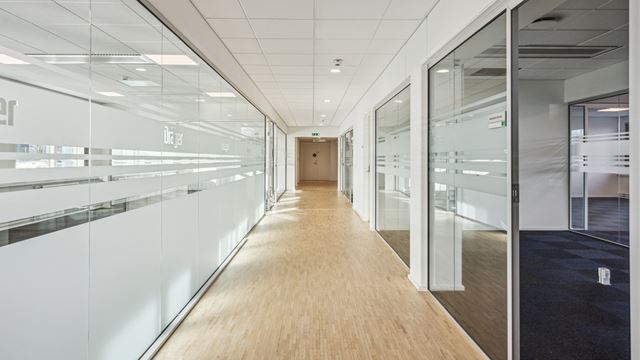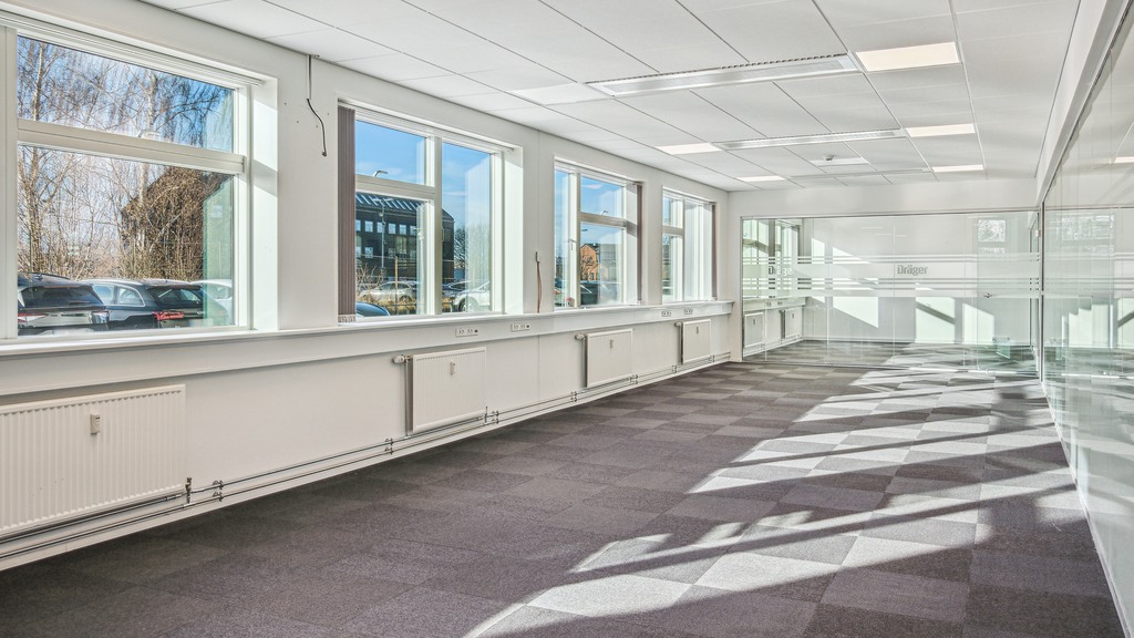 Bygningen er disponeret med lyse kontorområder og gode linjer, der gør det nemt at indrette fleksibelt efter behov. Udtrykket er professionelt og indbydende, så både medarbejdere og besøgende møder et repræsentativt miljø allerede ved ankomst.