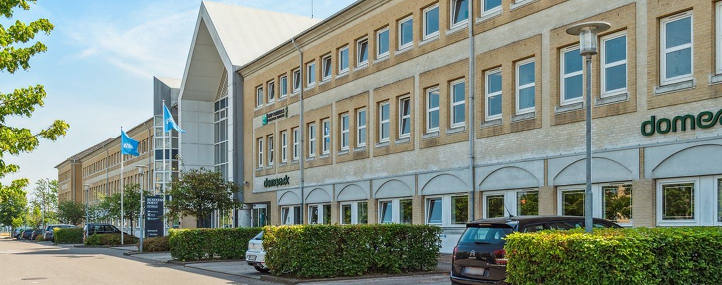 Moderne kontorejendom i Høje Taastrup med lyse lokaler, fælleskantine og nem adgang til station, motorvej og grønne omgivelser.